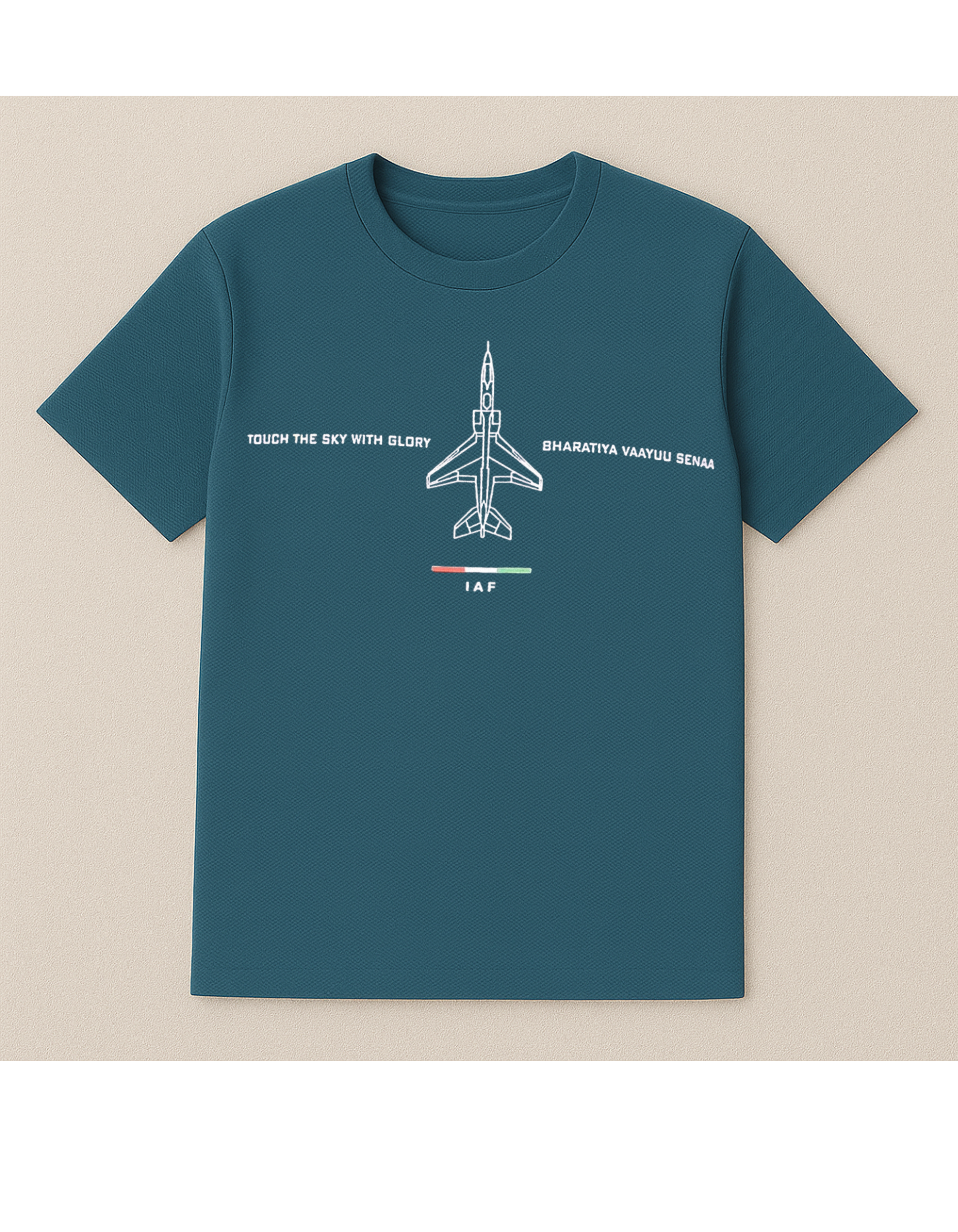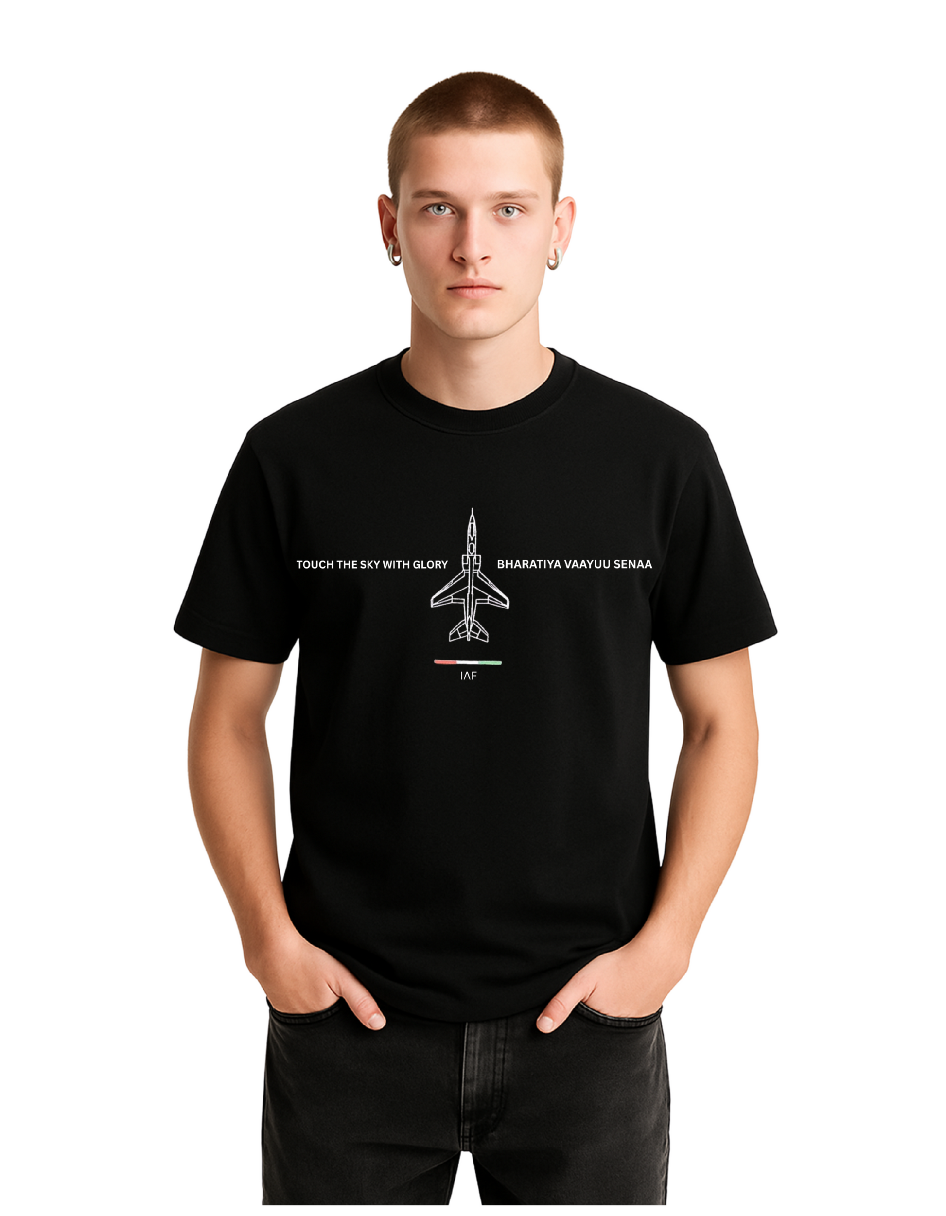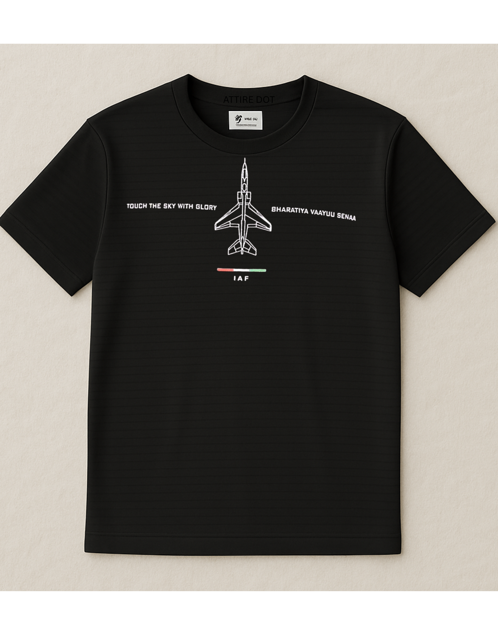 Celebrate the pride and power of the Indian Air Force with the Attire Dot ‘Touch the Sky Bhartiya Vayusena’ T-Shirt. Made from high-quality Premium Sport Dot Knit fabric, this black round-neck tee offers superior comfort, breathability, and a sleek, athletic fit. The front features a stunning graphic of an aircraft soaring through the skies, paired with the empowering ‘Touch the Sky’ message, symbolizing the relentless spirit of the Bhartiya Vayusena (Indian Air Force). Whether you’re an aviation enthusiast, military supporter, or just love a stylish graphic tee, this shirt brings both passion and performance to your wardrobe. A perfect blend of modern design and patriotic pride!