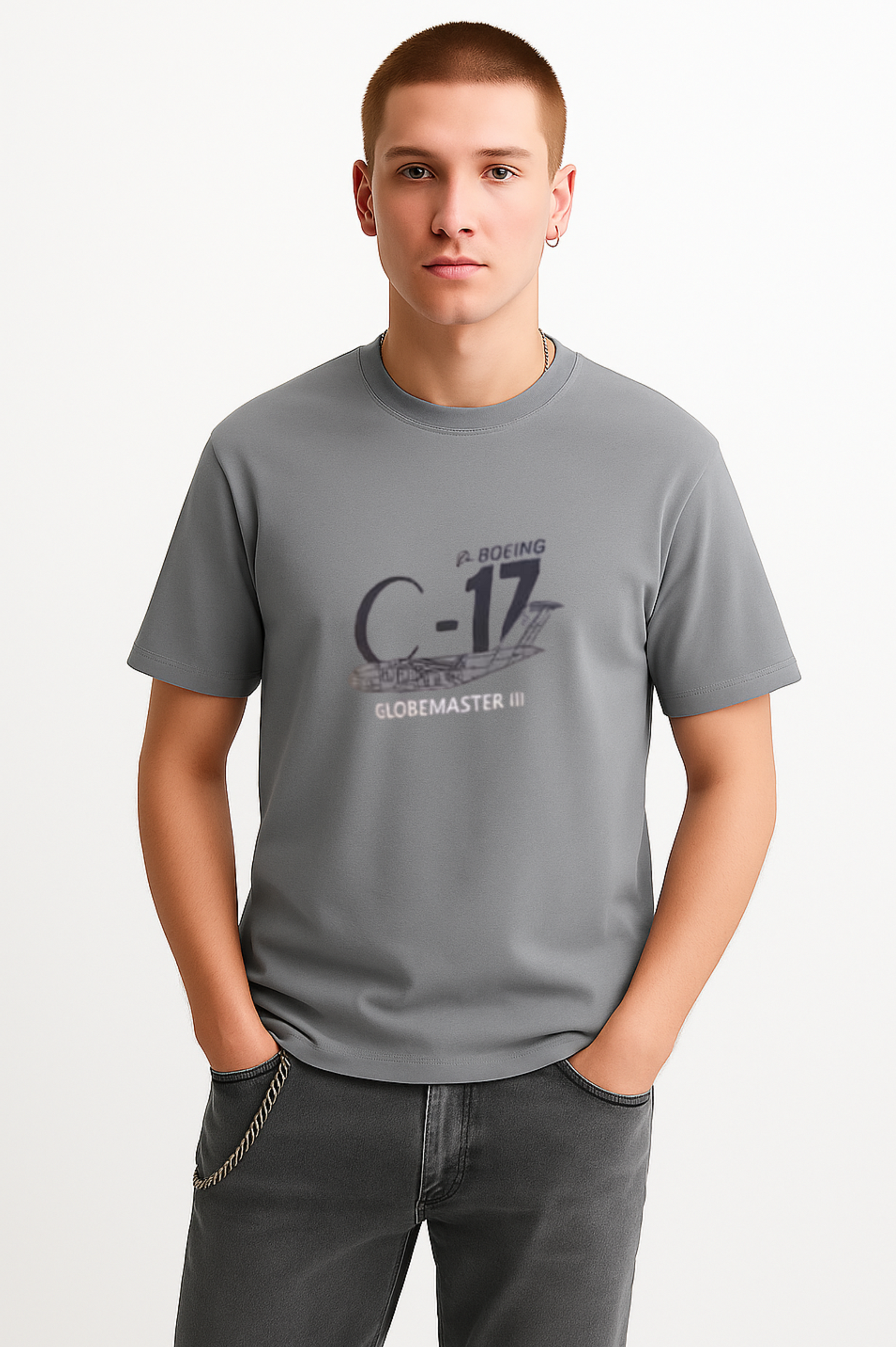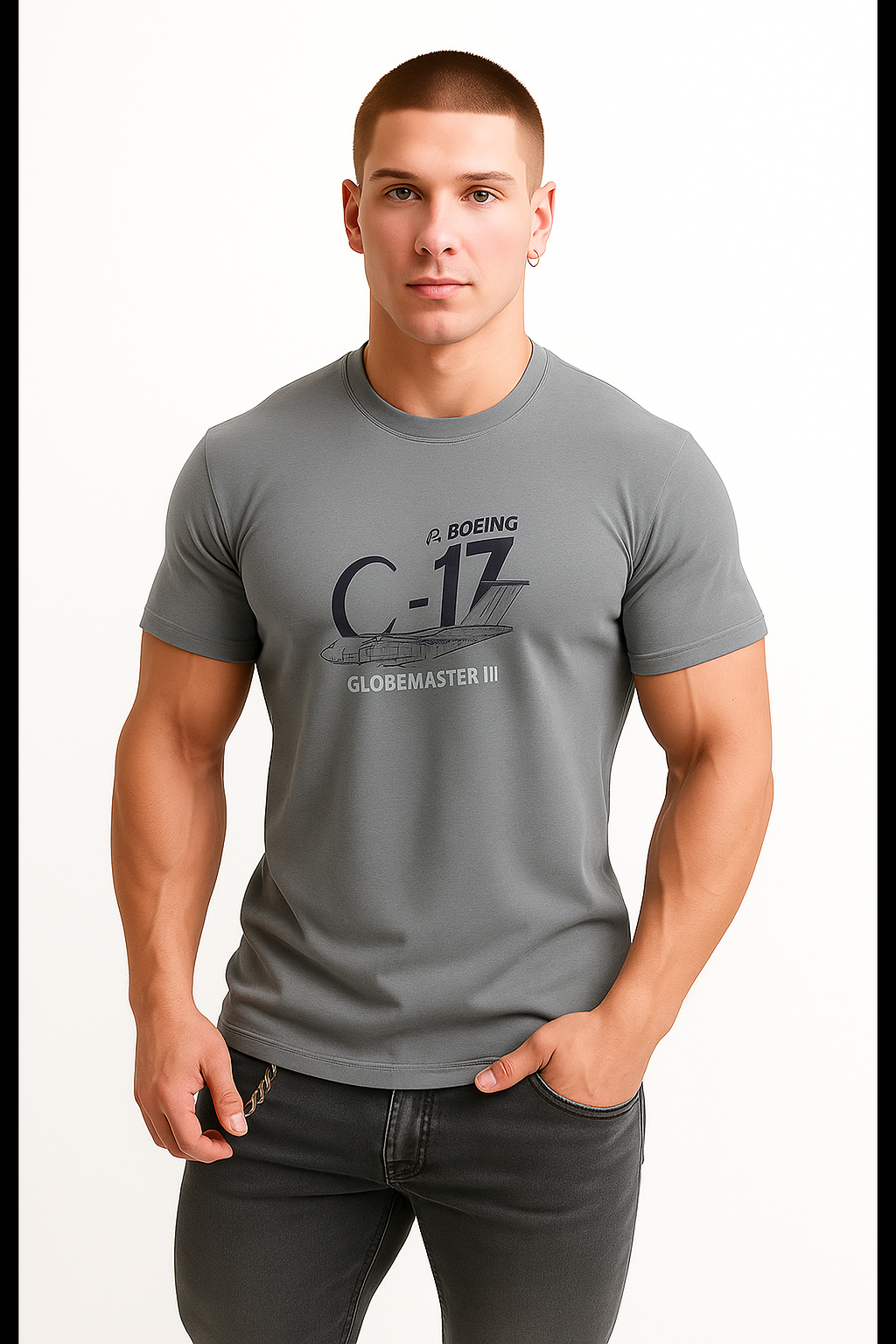 A sleek grey round neck t-shirt featuring a bold graphic of the Boeing C-17 Globemaster III, blending aviation heritage with modern streetwear style.