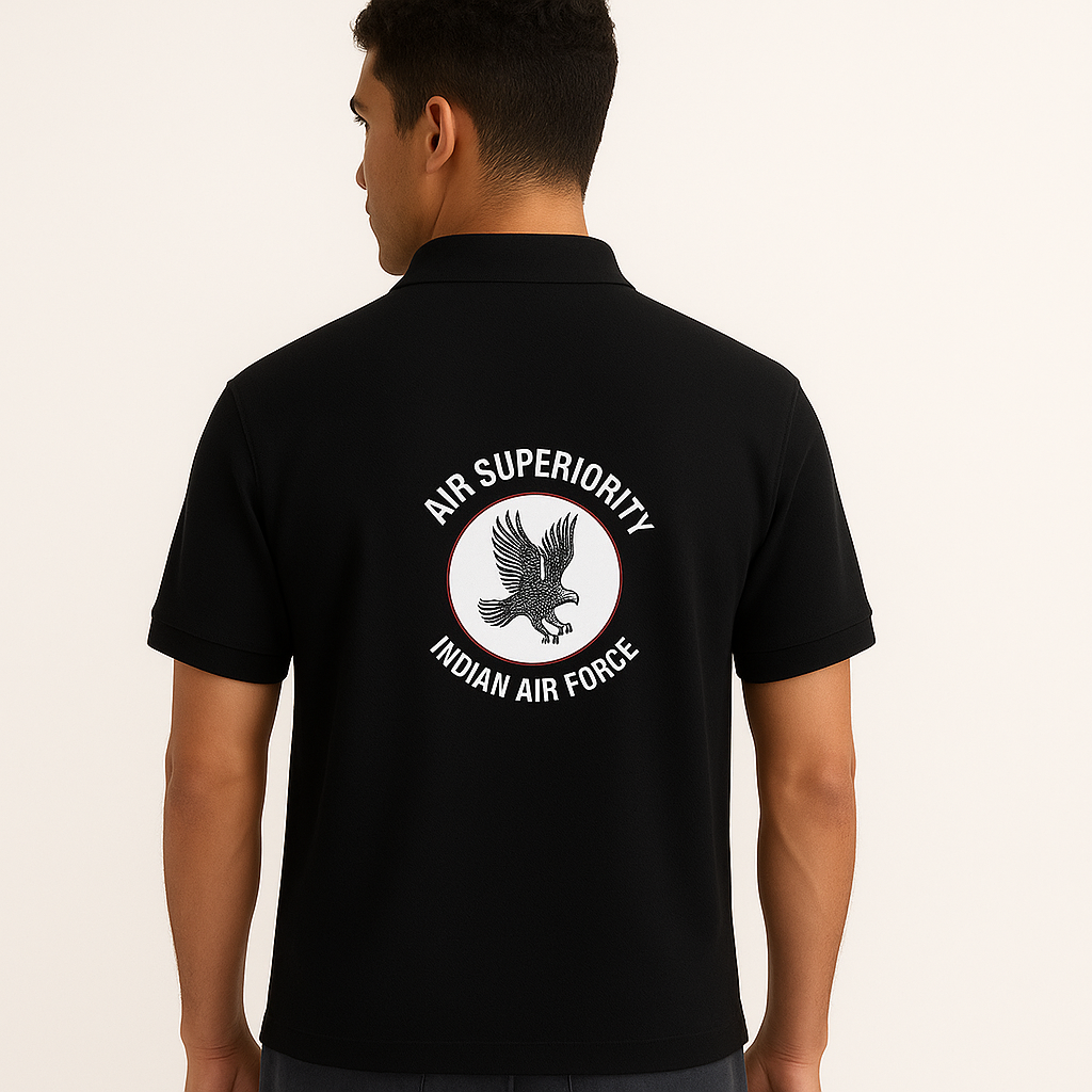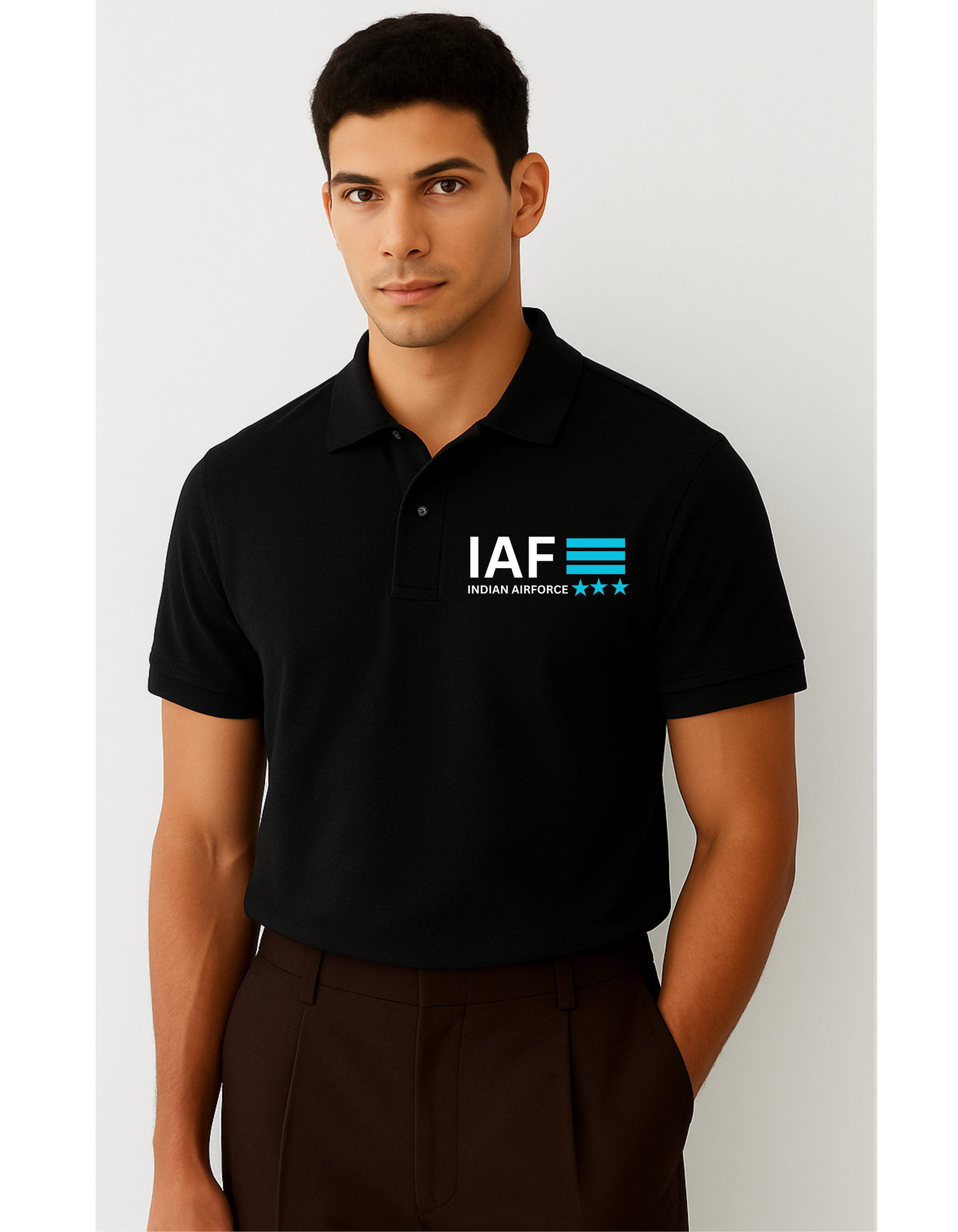 Black Polo T-Shirt – Sleek and minimal “INDIAN AIRFORCE” chest print, ideal for daily wear with a touch of pride.