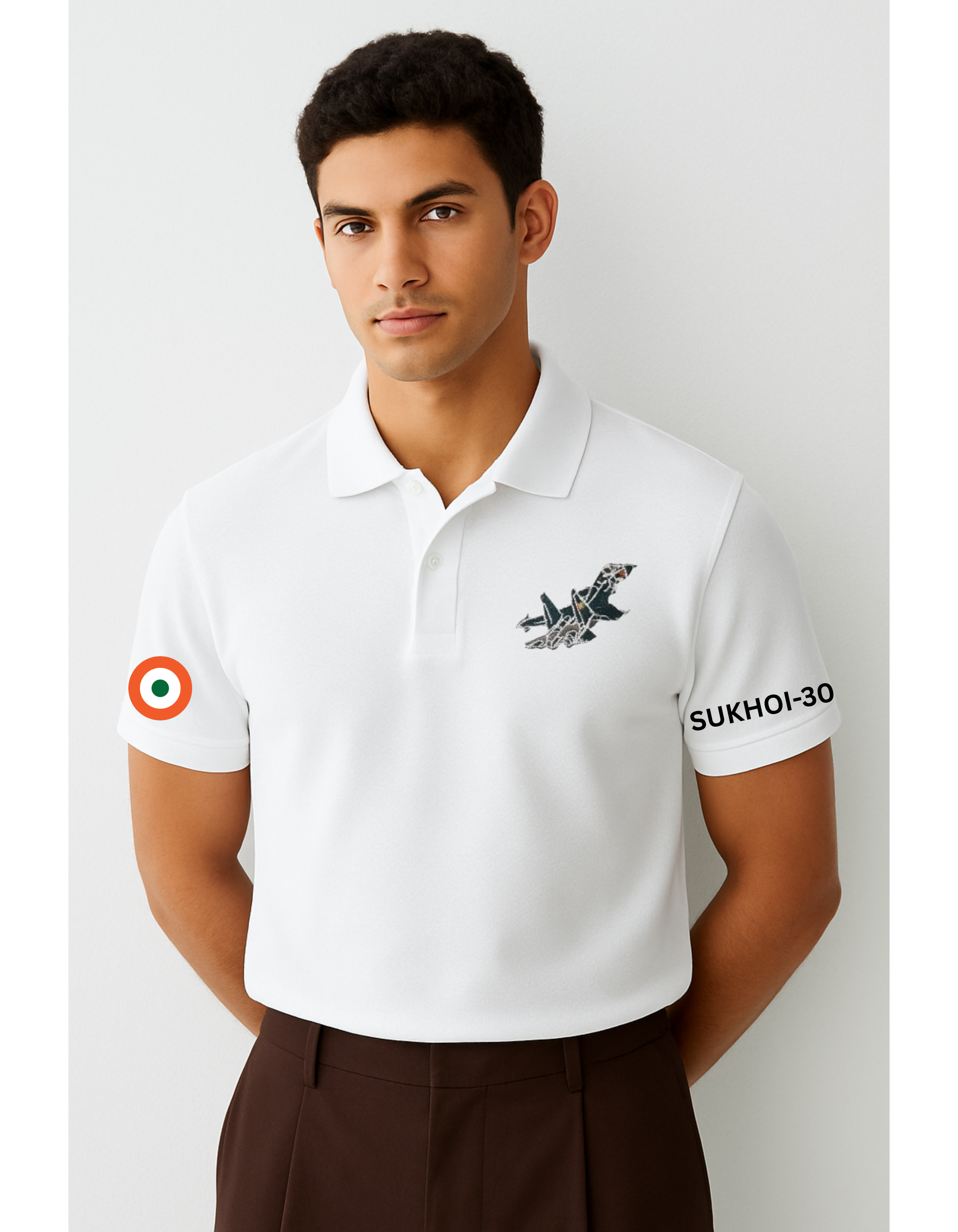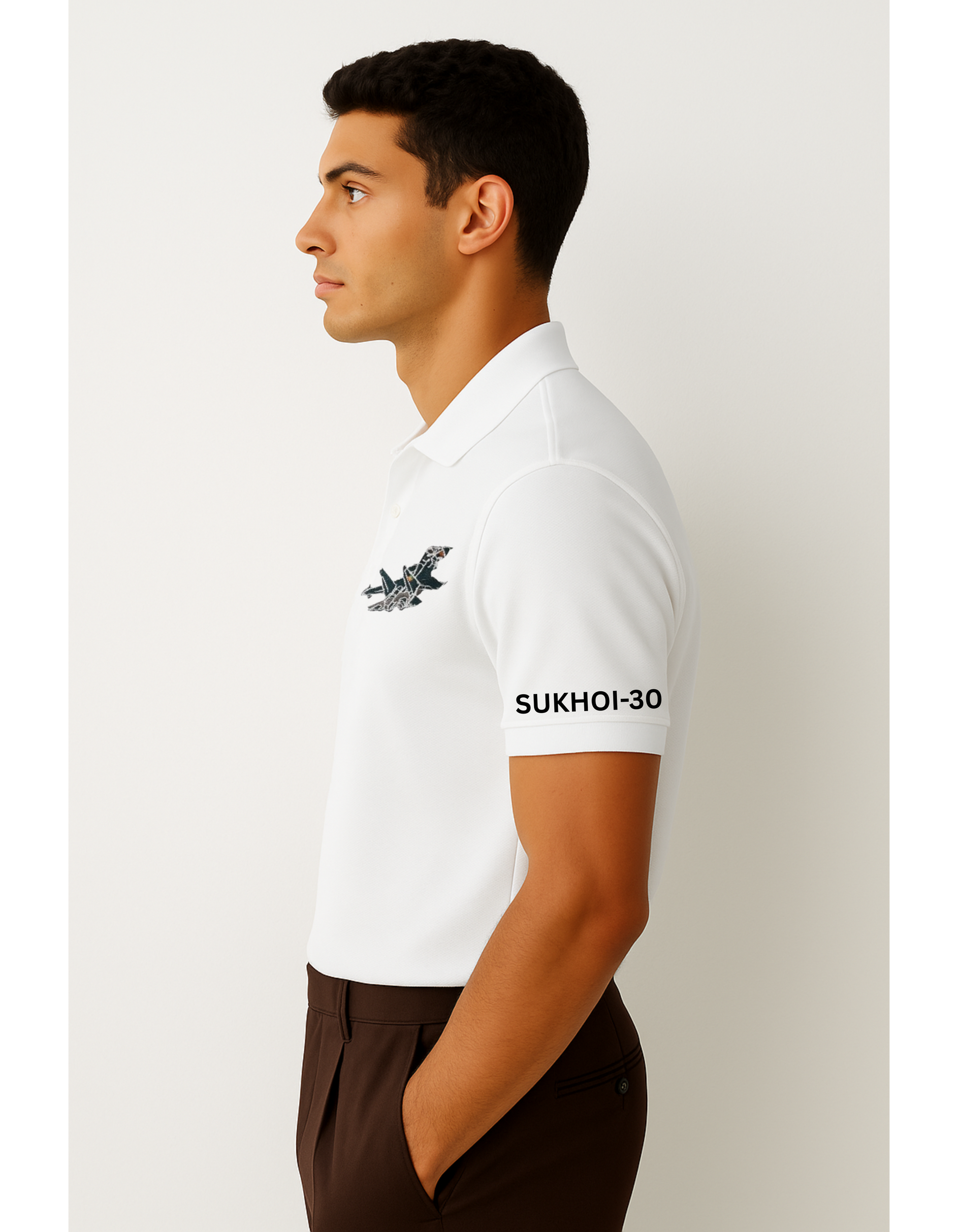 White SU-30 MKI Polo T-Shirt – Sleek and stylish print of the Indian Air Force's most iconic multi-role fighter jet.