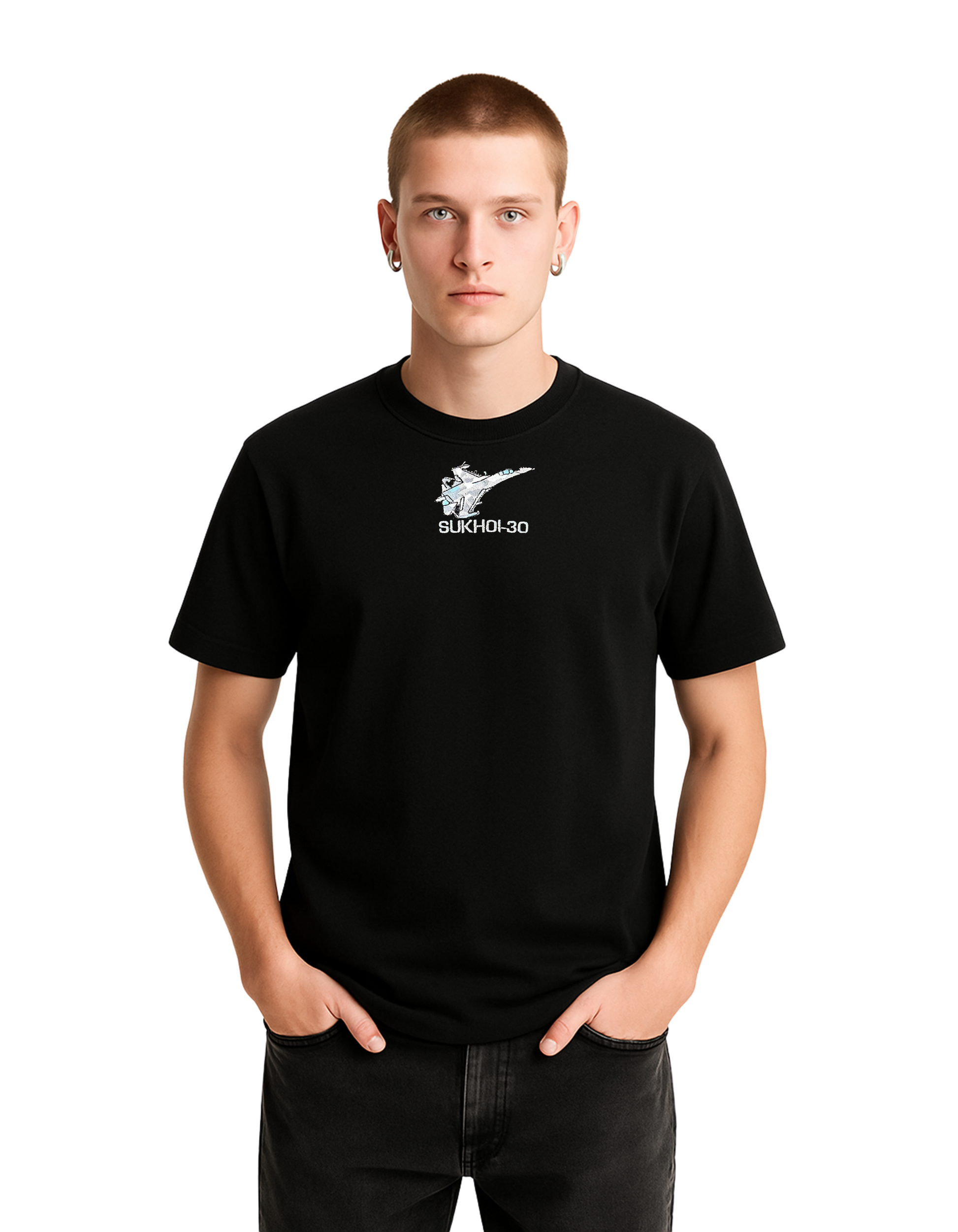 Design: Center chest print of Sukhoi-30 jet with bold typography