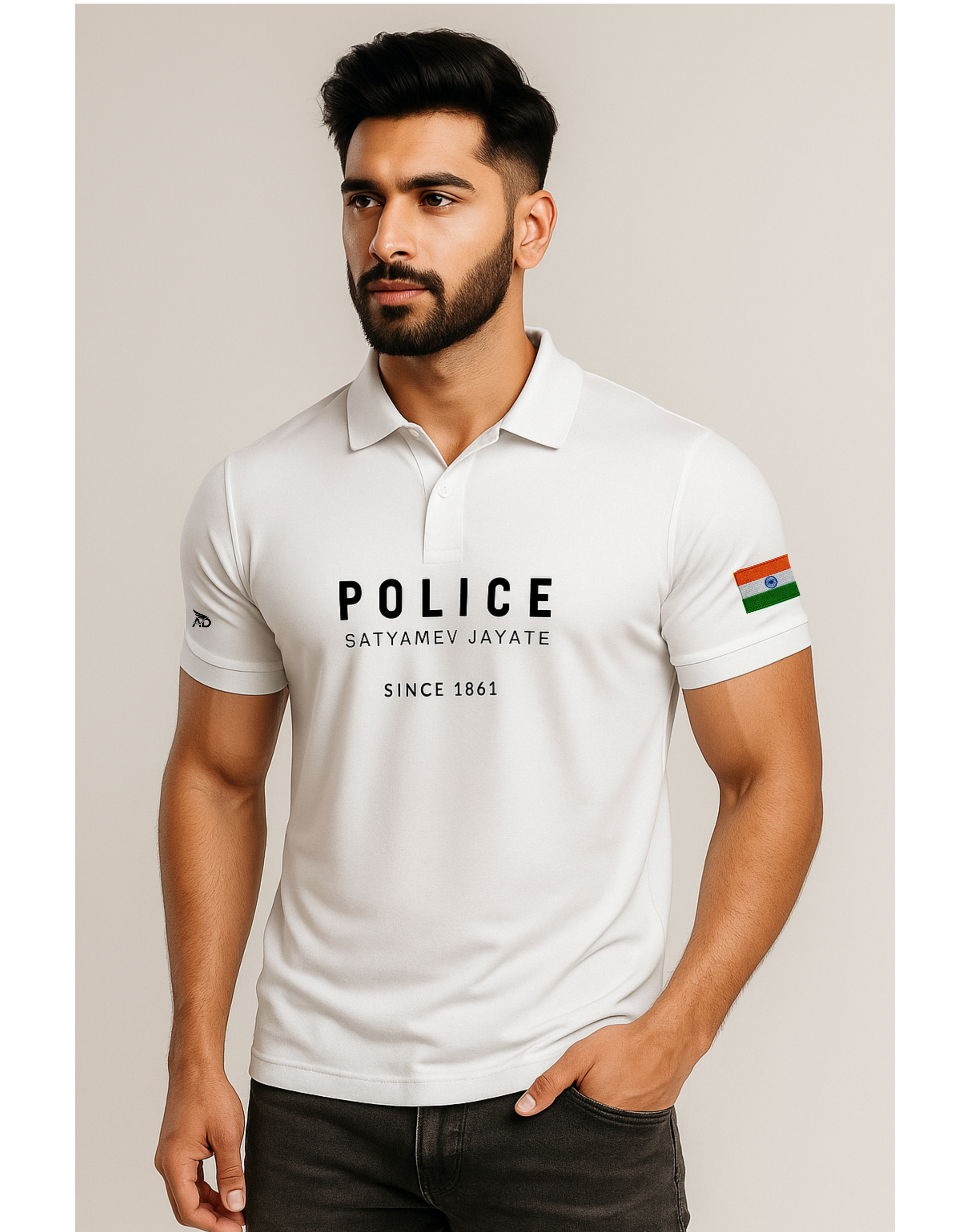 White Indian Police Polo T-Shirt – 240 GSM Cotton | Satyamev Jayate | Since 1861 | ATTIRE DOT